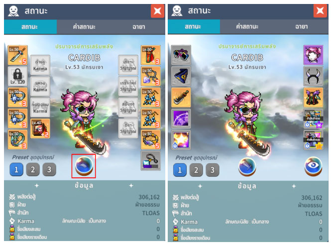 - ผู้เล่นสามารถตรวจสอบอุปกรณ์ที่กำลังสวมใส่อยู่