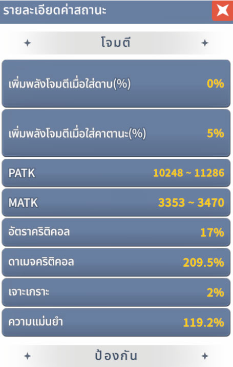 | อัตราคริติคอล | โอกาสที่จะติดคริติคอลเมื่อตัวละครโจมตีศัตรู |