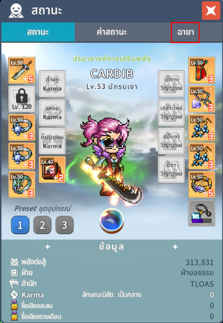- คุณสามารถตรวจสอบพลังรบ, ฝ่าย และสำนักได้