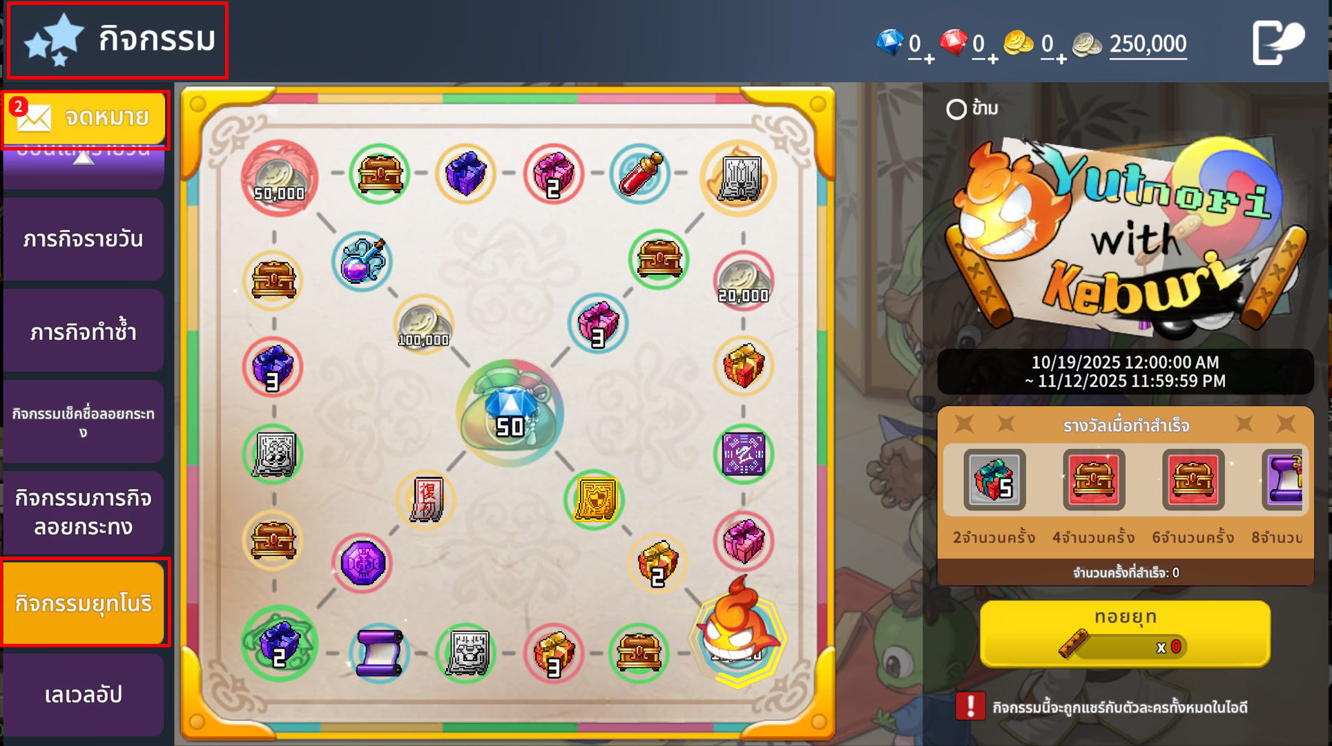2. ในเวลากิจกรรม ผู้เล่นจะต้องเข้าไปรับไอเทมกิจกรรม “ยุท” ผ่านกิจกรรม ภารกิจลอยกระทง