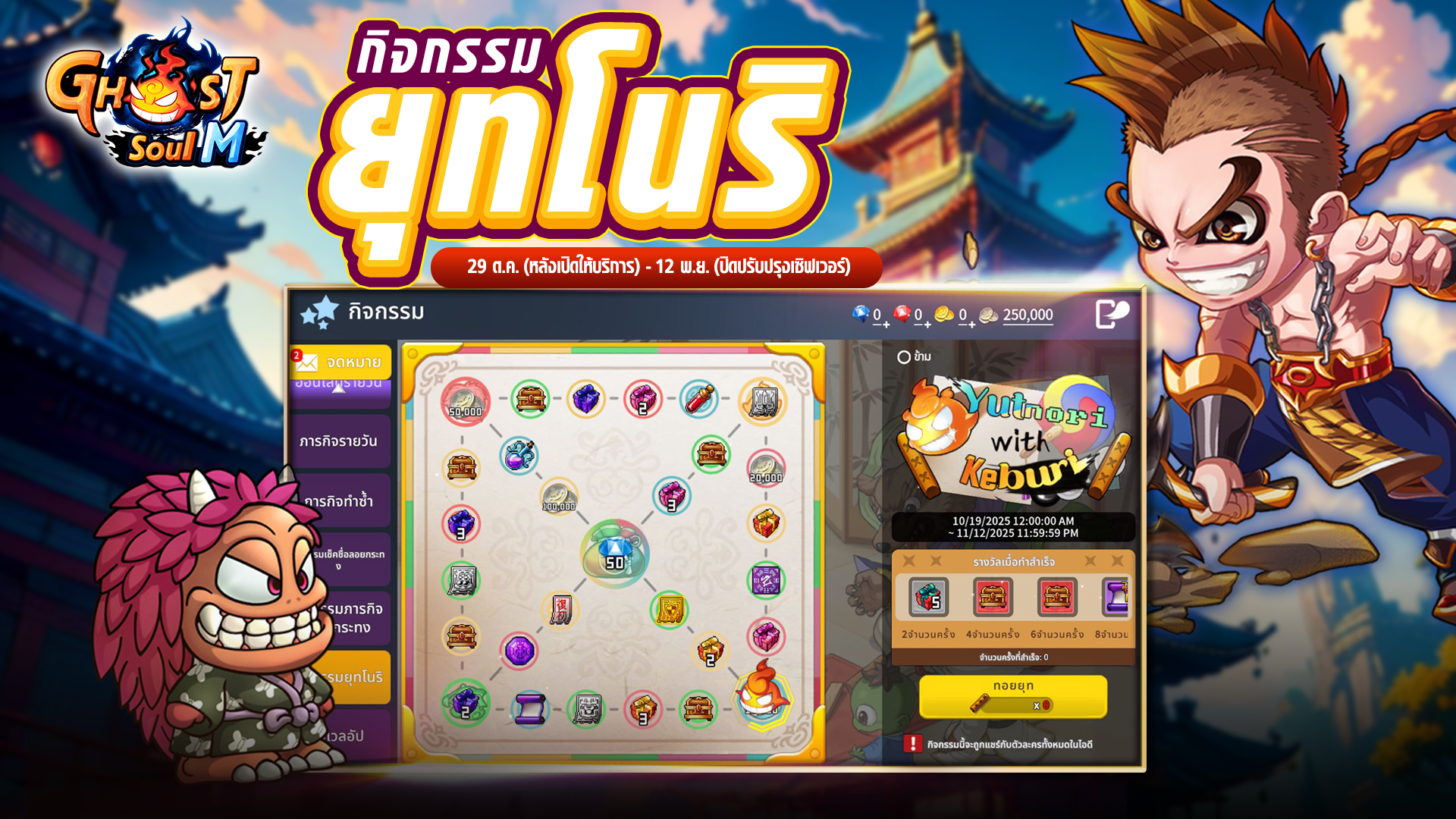 สายทอย ห้ามพลาด!! เทศกาลแห่งความสนุกสนาน กระดานยุทโนริขอมาแจม ร่วมสนุก 1 ได้รางวัลถึง 2 กิจกรรม เพียงร่วมสนุกกิจกรรมลอยกระทง จะได้รับ ยุท เพื่อนำมาทอยหมาก ลุ้นรับรางวัลในกระดานยุทโนริไปเลยทันที! กิจกรรมนี้นักปราบผีต้องมีเลเวล 20 ขึ้นไป เท่านั้นนะ!!