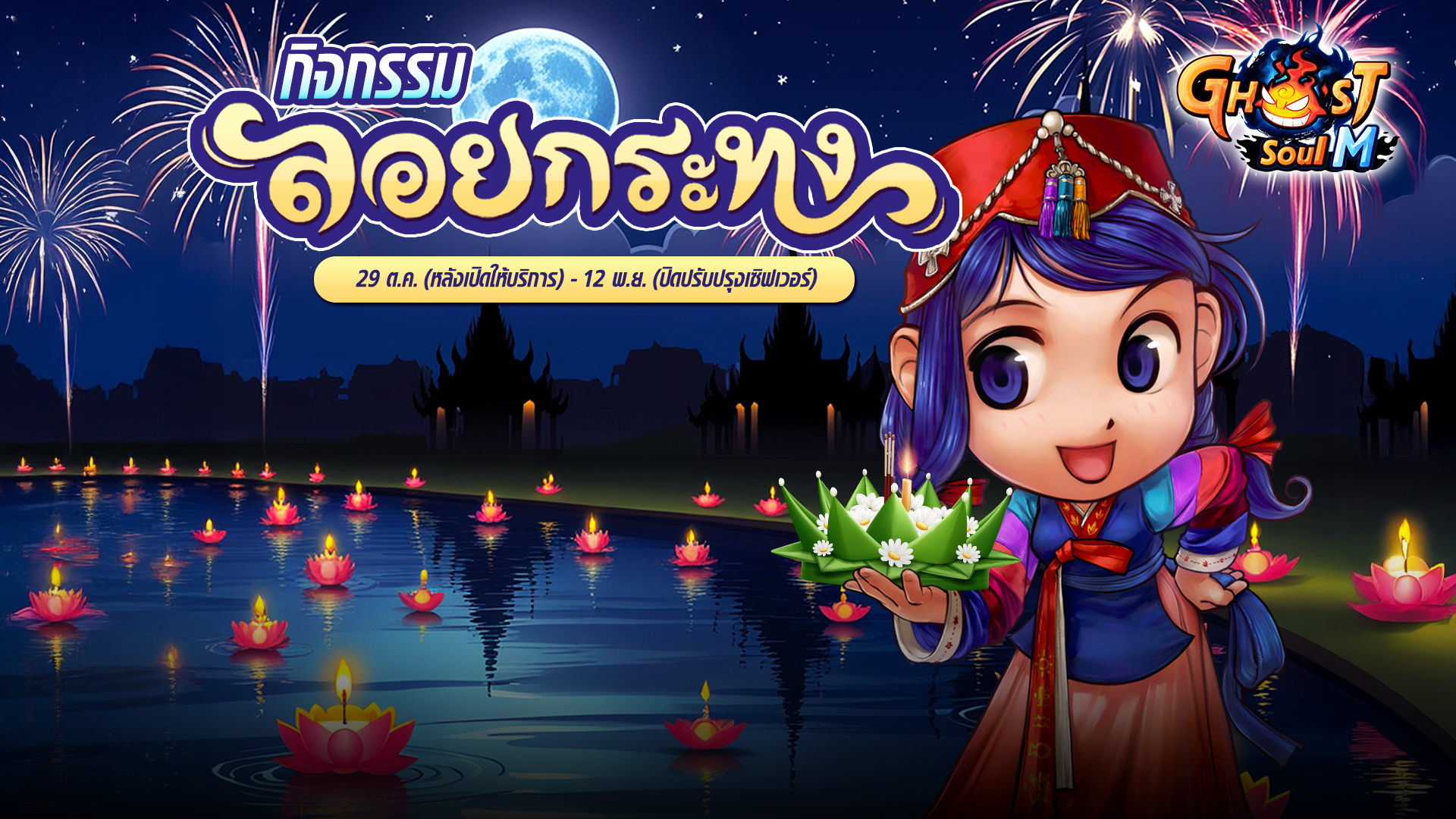 วันเพ็ญ บนโลกที่มีแต่ความสยอง หมาป่าหอนรับในช่วงเทศกาลลอยกระทง Ghost Soul M เซิร์ฟไทย ไม่อยากให้นักปราบผีอยู่กันเหงาๆ อยากชวนผู้ที่มีเลเวล 20 ขึ้นไป มารวบรวม ใบตอง เพื่อไปคราฟกระทง ขอพรกระต่ายจันทรากันเถอะ!! เมื่อกระต่ายจันทราลงมาเยือนต้องมีรางวัลเทพๆ มาแจกแน่นอน!!