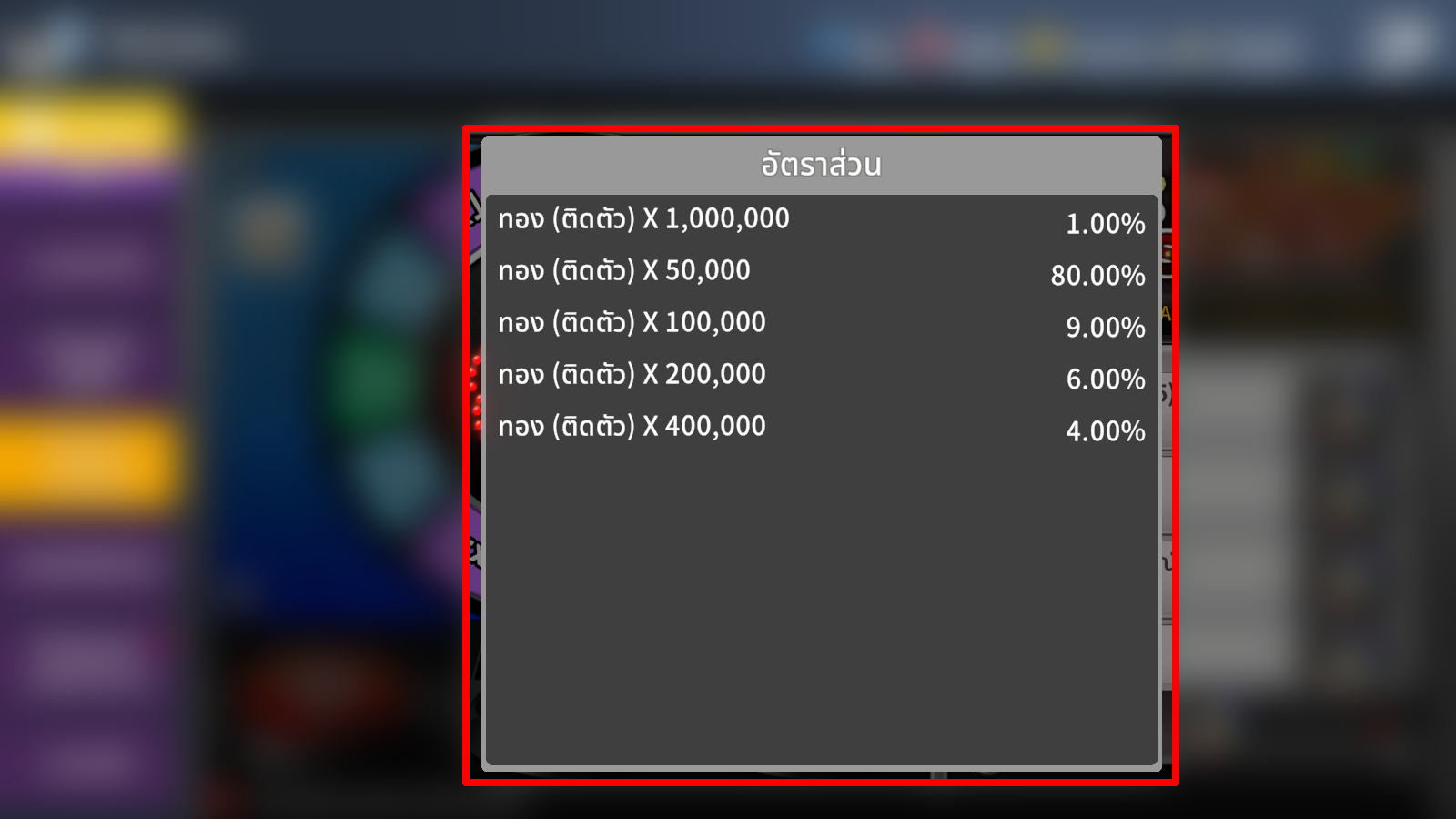 • 1 เท่า 50,000 ทอง (ติดตัว) โอกาส 80%