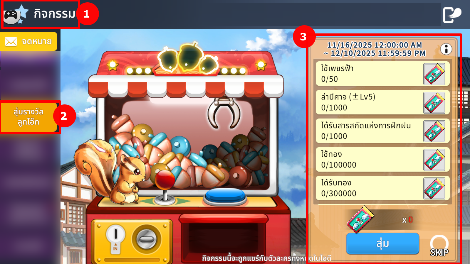 1. ผู้เล่นจะต้องทำภารกิจกำหนดต่างๆ ภายในเกม เพื่อรับตั๋ว “สุ่ม” สำหรับสุ่มรางวัลลูกโอ๊กได้ โดยเลือกที่ไอคอน [ตั๋วลูกโอ๊ก] หลังจากเสร็จสิ้นรางวัลภารกิจ