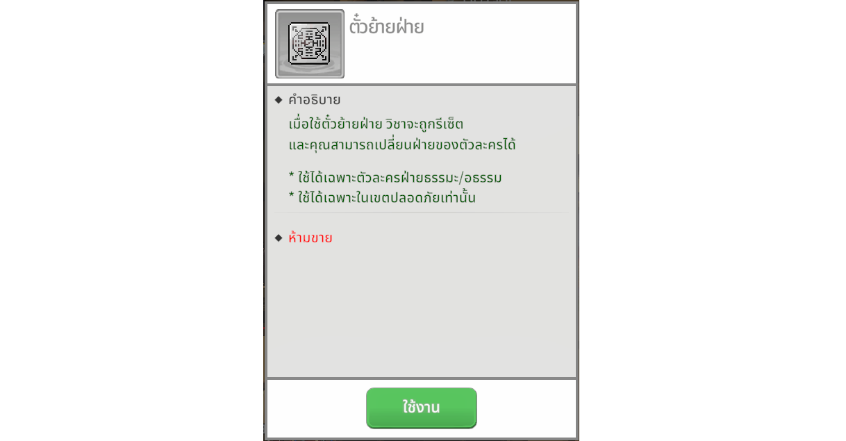 • ฟังก์ชัน: ไอเทมนี้ใช้สำหรับ เปลี่ยนฝ่ายของตัวละคร