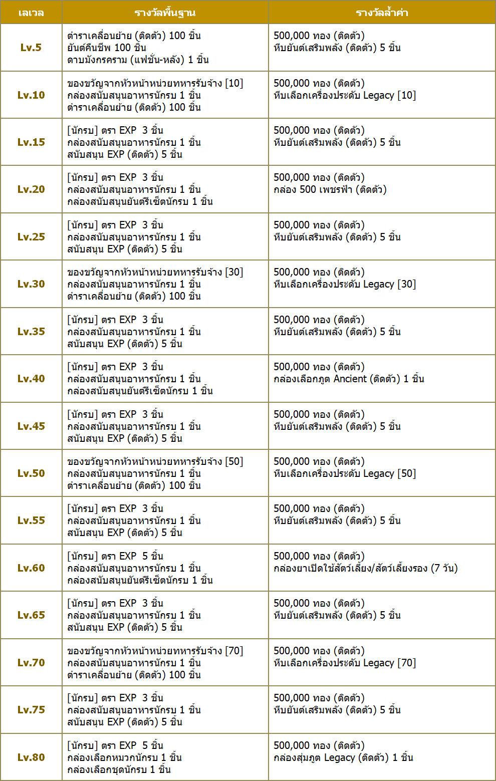 2. การรับรางวัลมี 2 ประเภท คือ รางวัลพื้นฐาน และ รางวัลล้ำค่า โดยผู้เล่นสามารถซื้อ “รางวัลล้ำค่า” เพิ่มเติมได้โดยใช้ เงิน 10,000 ทอง