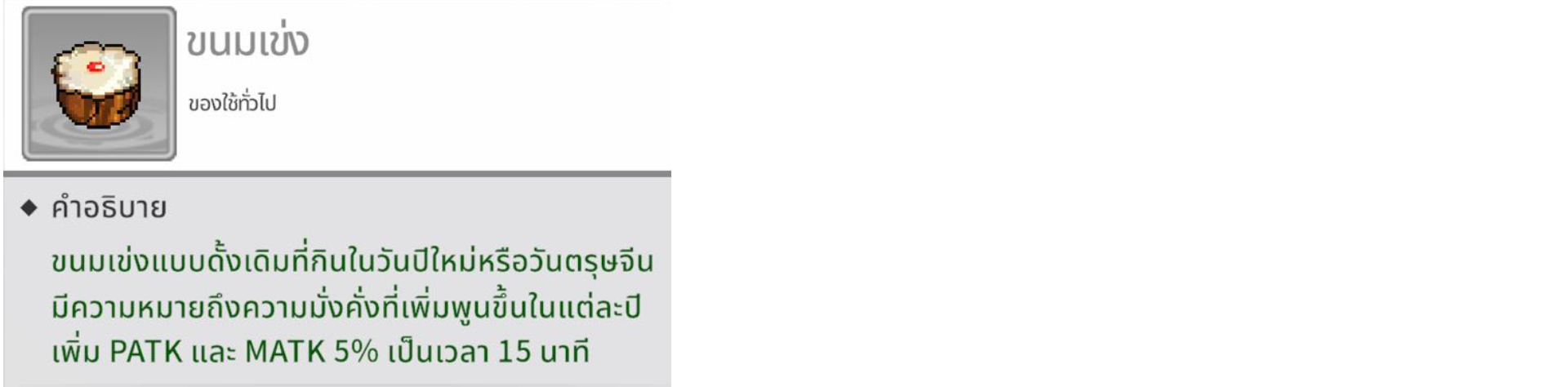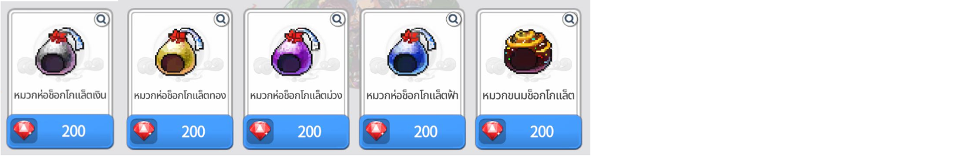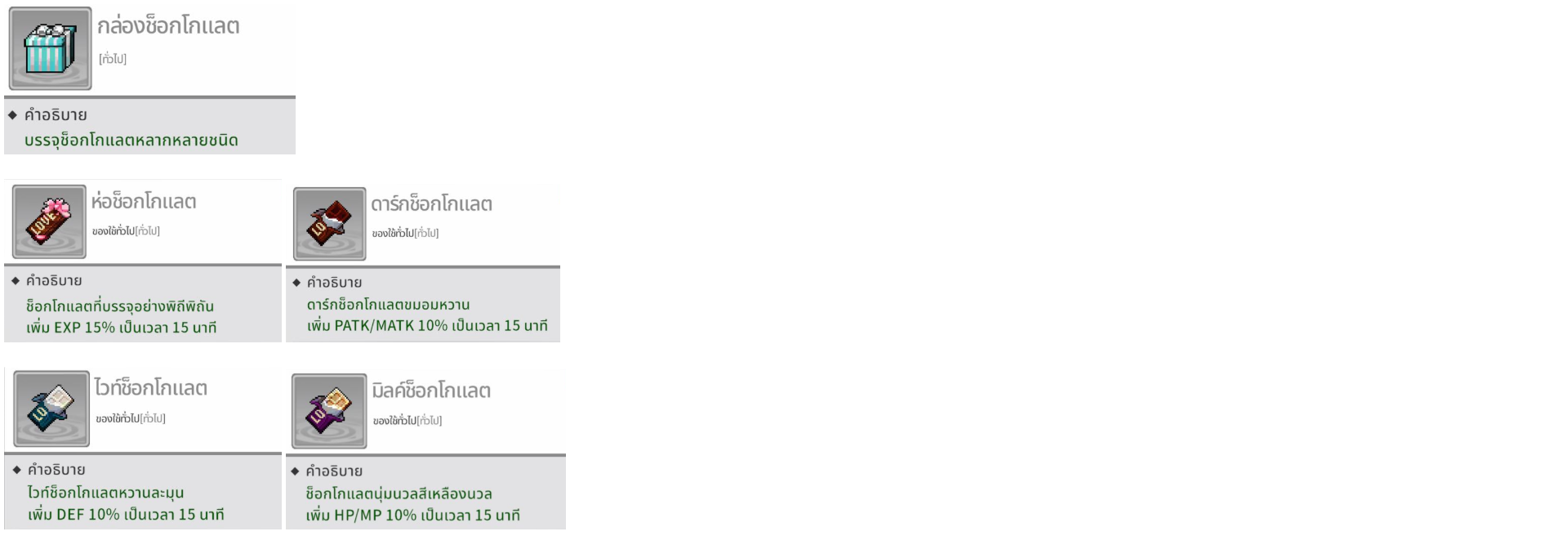 4. บัฟจากช็อกโกแลต (นาน 15 นาที): สุ่มรับบัฟต่างๆ เช่น EXP +15% (ช็อกโกแลตบรรจุกล่อง), พลังโจมตี +10% (ช็อกโกแลตดำ), พลังป้องกัน +10% (ช็อกโกแลตขาว) และ HP/MP +10% (ช็อกโกแลตเหลือง)