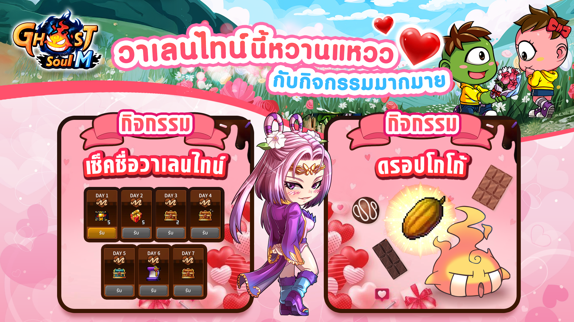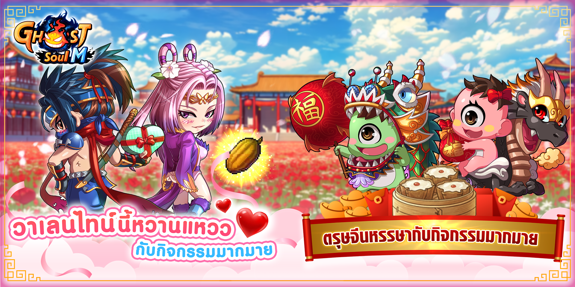 เดือนกุมภาพันธ์ Ghost Soul M ขอผนึก 2 เทศกาล อัปเดตความสนุกให้กับเหล่าผู้กล้าได้จูงมือคนรู้ใจ พาร์ทเนอร์ หรือเพื่อนร่วมก๊วน เข้ามาร่วมกิจกรรมต่างๆ มากมาย ไม่ว่าจะเป็นเทศกาลวาเลนไทน์ที่บอกเลยว่า ต้องหว๊าน หวานจนลืมภูตผี หรือเทศกาลตรุษจีนที่มีแต่ความเฮง ความปัง หากไม่อยากพลาดความอลังที่พร้อมจัดเต็มในวันที่ 11 กุมภานี้ รีบไปติดตามรายละเอียดการอัปเดตระบบ และกิจกรรมใหม่ต่างๆ กันเลยจ้า
