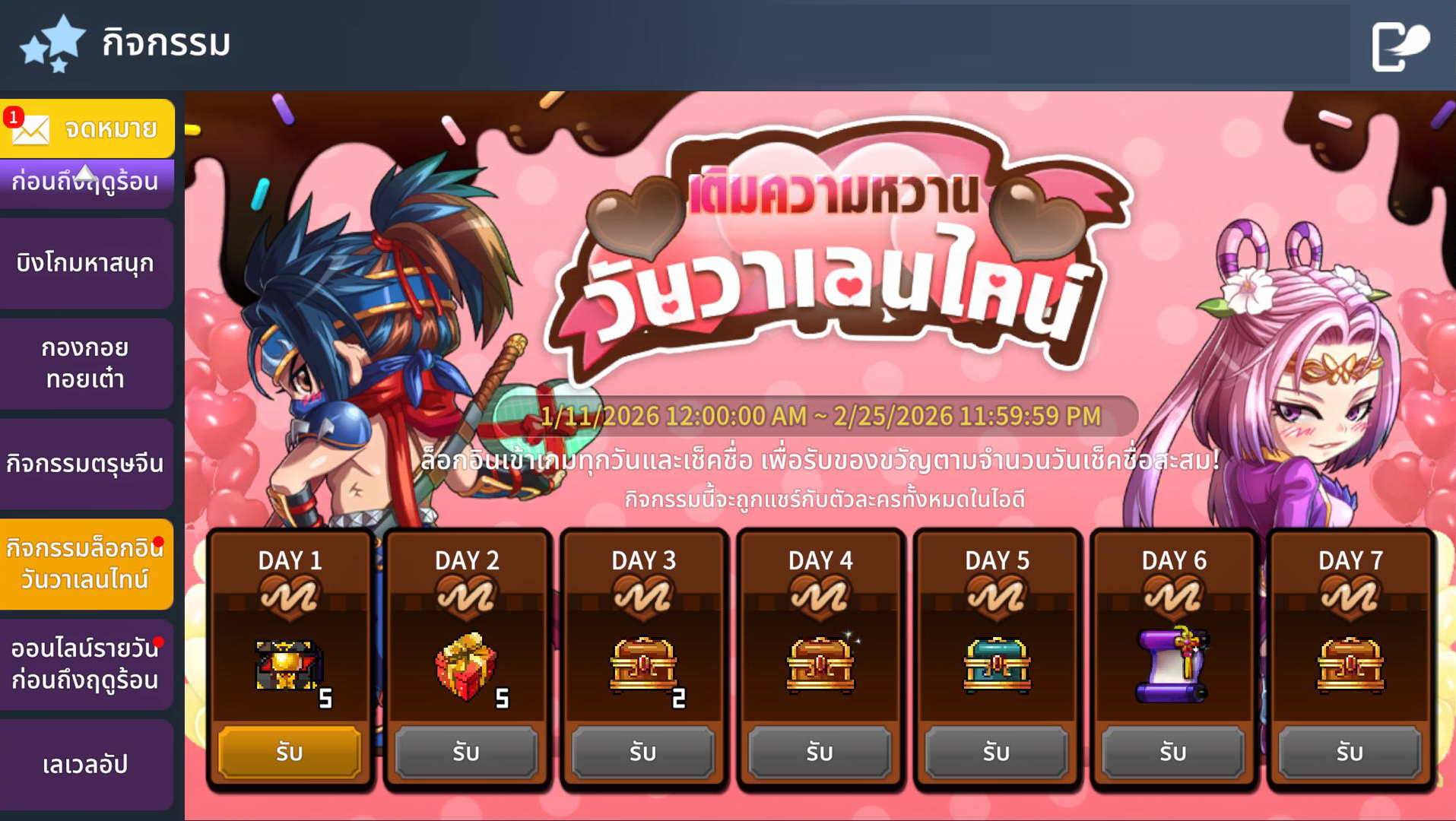 **หมายเหตุ: ไอเทมรางวัลกิจกรรมส่วนใหญ่เป็นประเภท (ติดตัว) และรางวัลในจดหมายจะมีระยะเวลากดรับภายใน 3 วัน