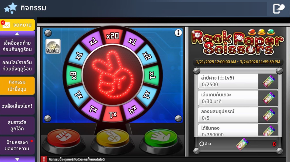 รวบรวมตั๋วจากการล่ามอนสเตอร์และออนไลน์ครบเวลา เพื่อมาท้าดวลเป่ายิ้งฉุบ ลุ้นรับรางวัลทอง (ติดตัว) คูณสูงสุดถึง 20 เท่า