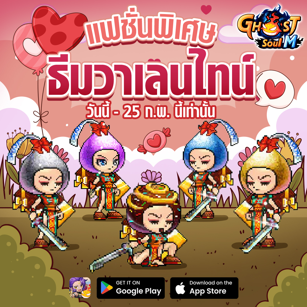 เดือนกุมภาพันธ์ Ghost Soul M ขอผนึก 2 เทศกาล อัปเดตความสนุกให้กับเหล่าผู้กล้าได้จูงมือคนรู้ใจ พาร์ทเนอร์ หรือเพื่อนร่วมก๊วน เข้ามาร่วมกิจกรรมต่างๆ มากมาย ไม่ว่าจะเป็นเทศกาลวาเลนไทน์ที่บอกเลยว่า ต้องหว๊าน หวานจนลืมภูตผี หรือเทศกาลตรุษจีนที่มีแต่ความเฮง ความปัง หากไม่อยากพลาดความอลังที่พร้อมจัดเต็มในวันที่ 11 กุมภานี้ รีบไปติดตามรายละเอียดการอัปเดตระบบ และกิจกรรมใหม่ต่างๆ กันเลยจ้า